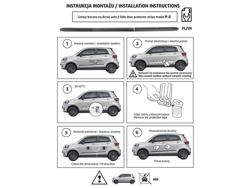 Přesné rozměry lišty dveří najdete ve fotogalerii, kde jsou i fotky bočních lišt, nainstalovaných na tomto modelu auta. V záložce Soubory je ke stažení podrobný návod a montážní schéma s umístěním bočních lišt na tomto autě.