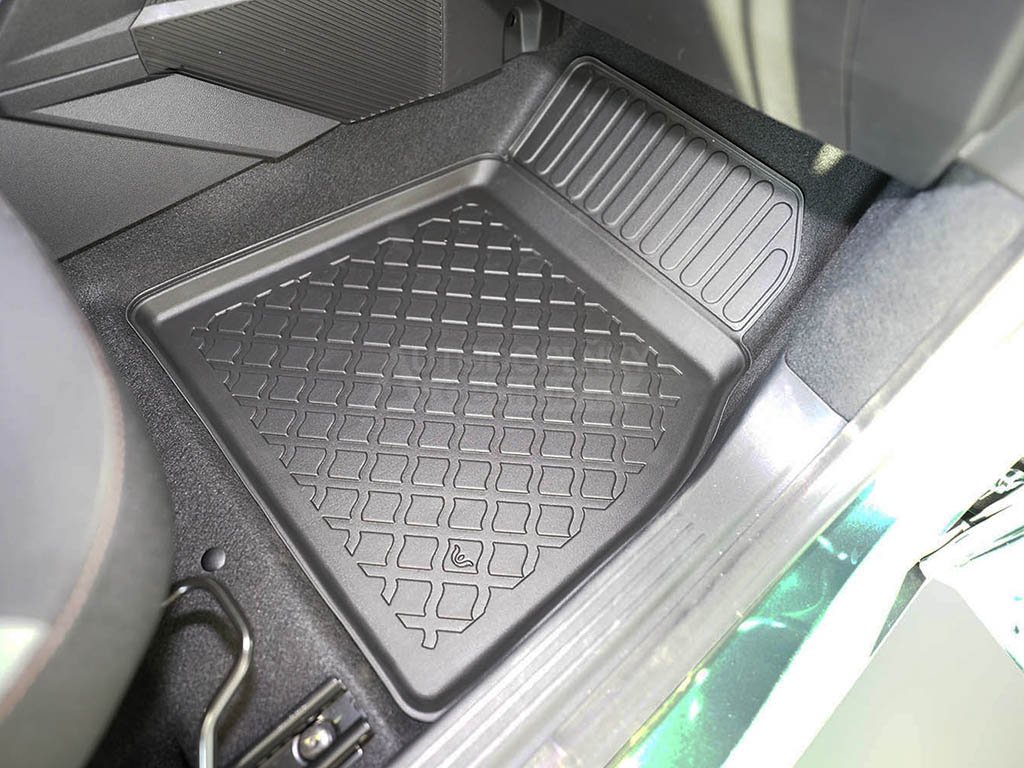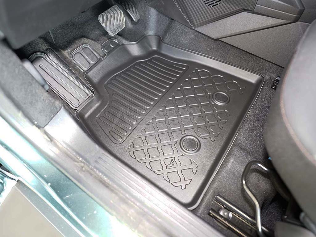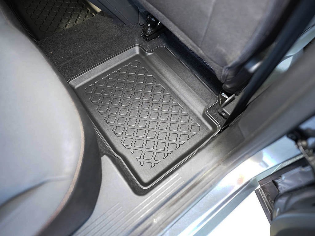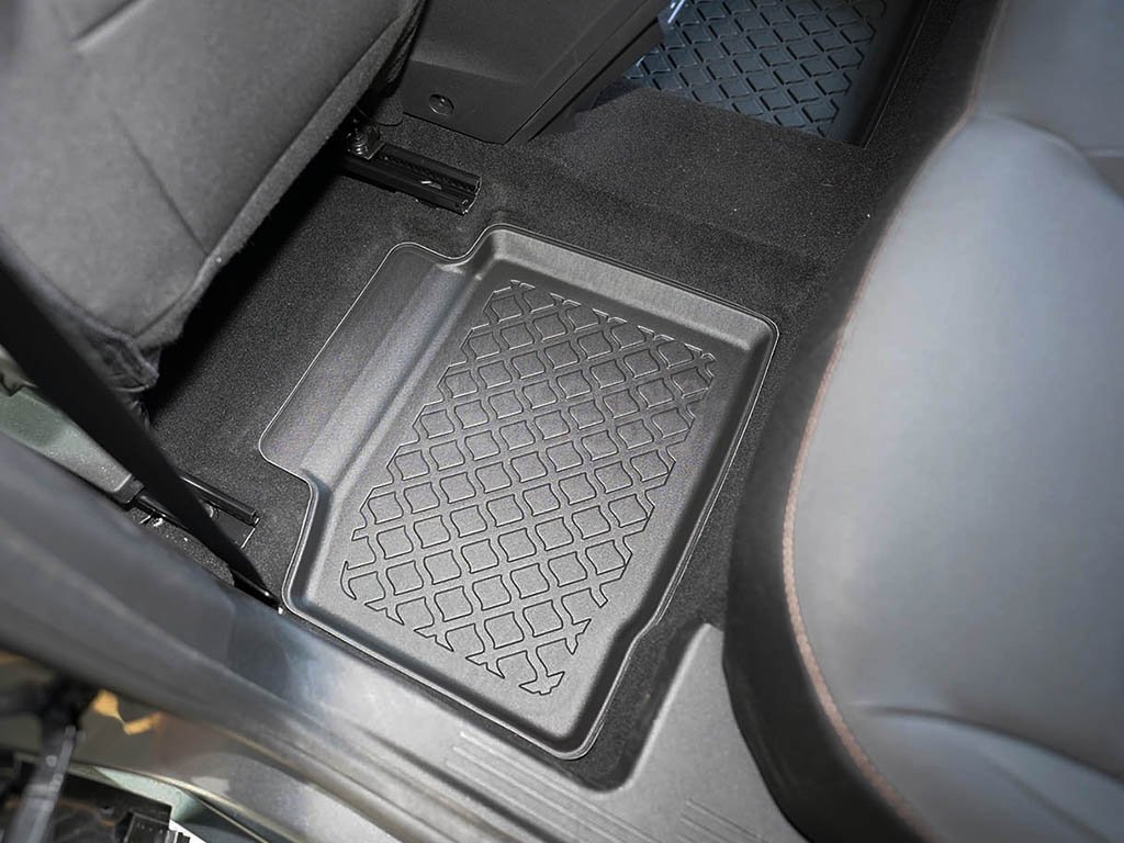 Přesně pasující autokoberce z pevnějšího a velmi odolného termoplastického materiálu s příměsí gumy využijete v jakémkoli ročním období, obzvláště pak od podzimu do jara. Velkou výhodou oproti čistě gumovým kobercům do auta je zvýšený 3 cm okraj, díky kterému i větší množství nečistot nebo vody ze sněhu neznečistí interiér vašeho vozu.