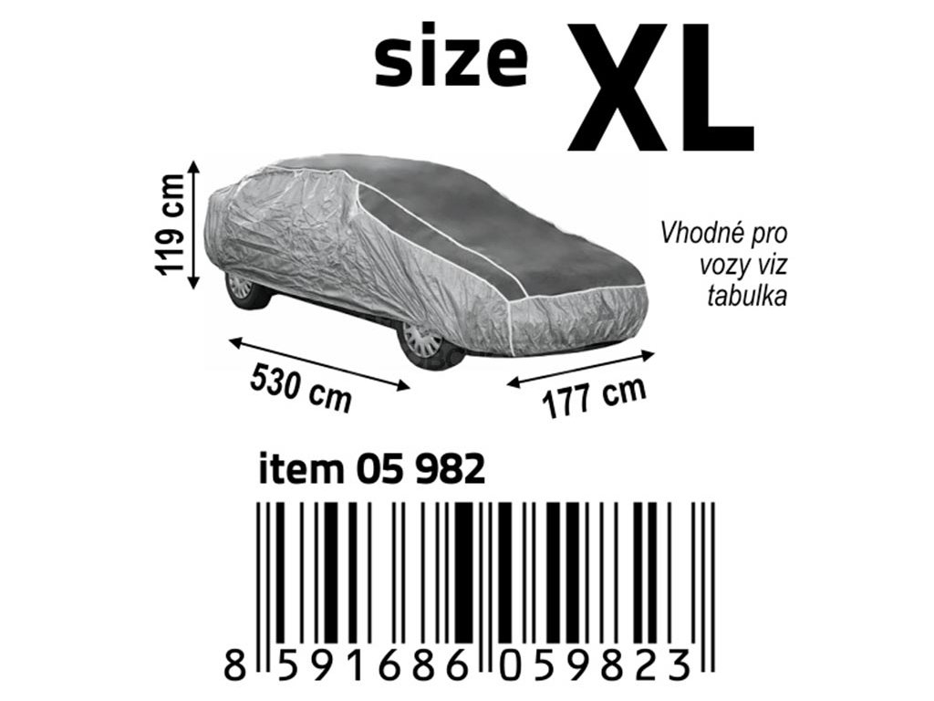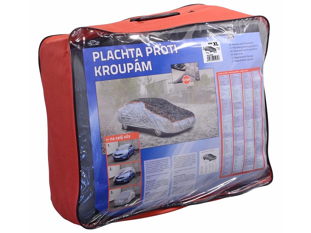 Ochranná plachta proti kroupám na celý vůz, která zabraňuje poškození laku auta kroupami o velikosti až 12 mm.Velikost XL, rozměr 530 x 177 x 119cm. Materiál: EVA, nylon.