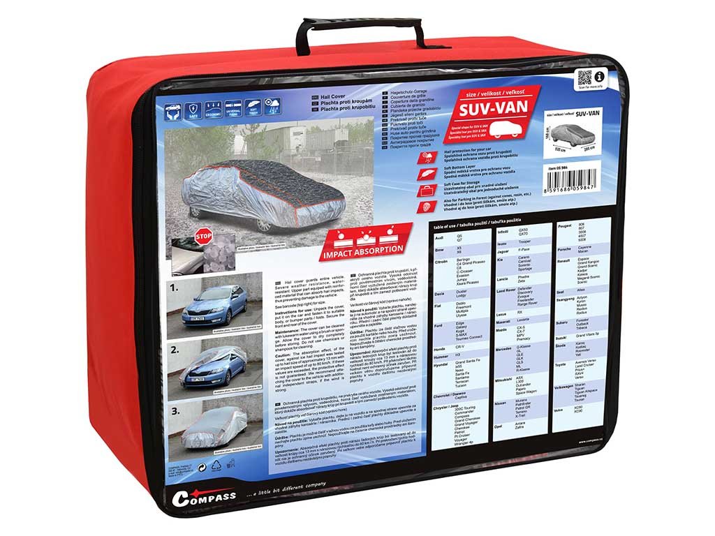 Ochranná plachta proti kroupám na celý vůz, která zabraňuje poškození laku auta kroupami o velikosti až 12 mm.Velikost SUV-VAN, rozměr 530 x 205 x 160 cm. Materiál: EVA, nylon.