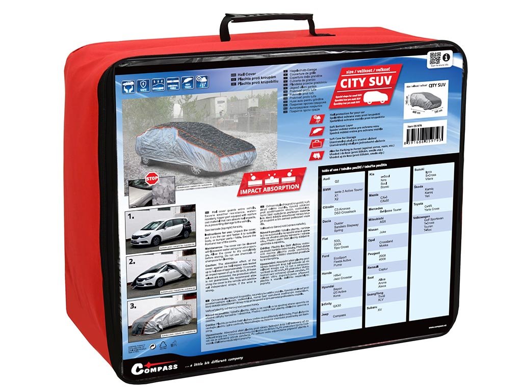 Ochranná plachta proti kroupám na celý vůz, která zabraňuje poškození laku auta kroupami o velikosti až 12 mm. Velikost CITY SUV, rozměr 460 x 185 x 145 cm. Materiál: EVA, nylon.