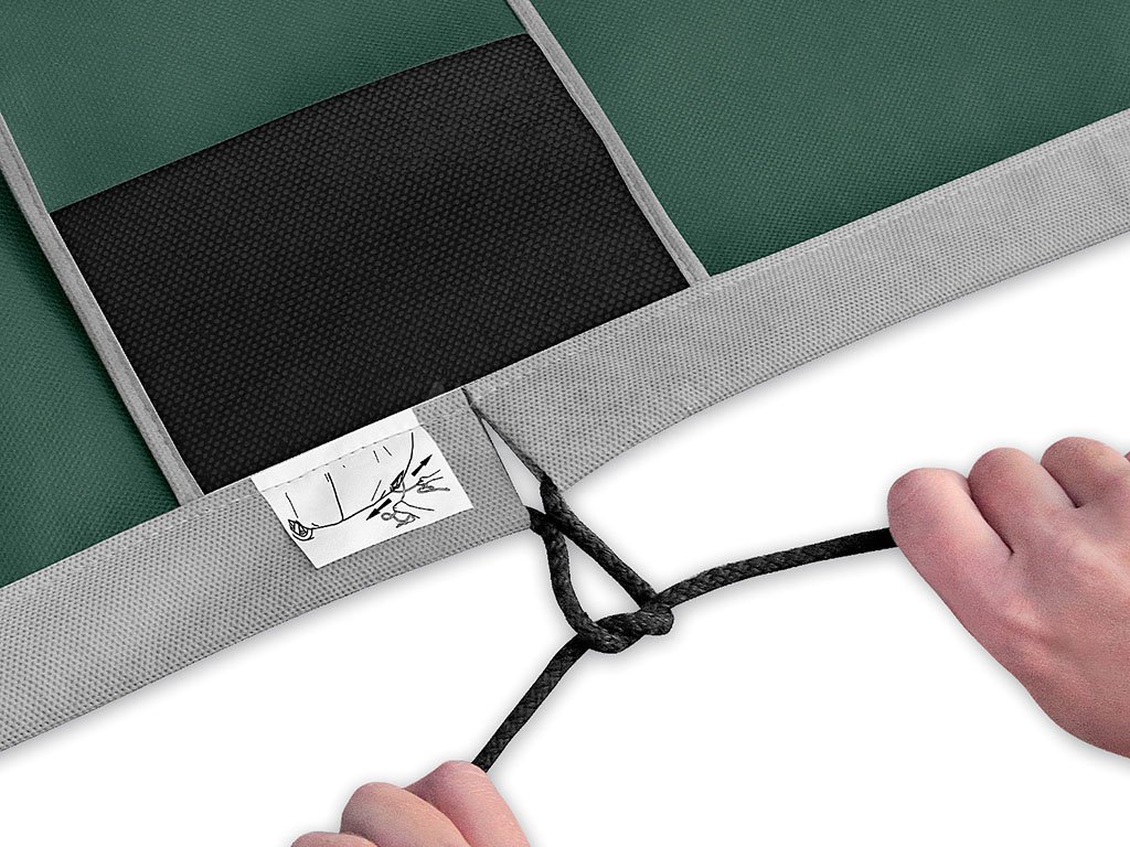 Stačí zatáhnout dva konce tkaničky proti sobě, zavázat a plachta se tím upevní kolem podvozku auta. Poté ji můžete schovat do našité kapsy na plachtě.