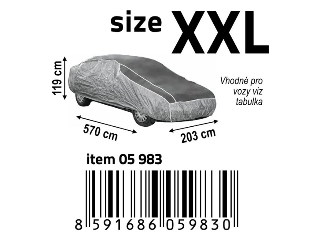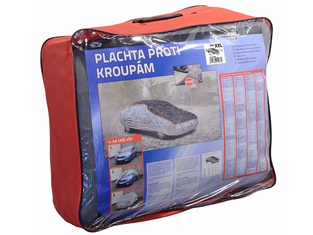 Ochranná plachta proti kroupám na celý vůz, která zabraňuje poškození laku auta kroupami o velikosti až 12 mm.Velikost XXL, rozměr 570 x 203 x 119cm. Materiál: EVA, nylon.