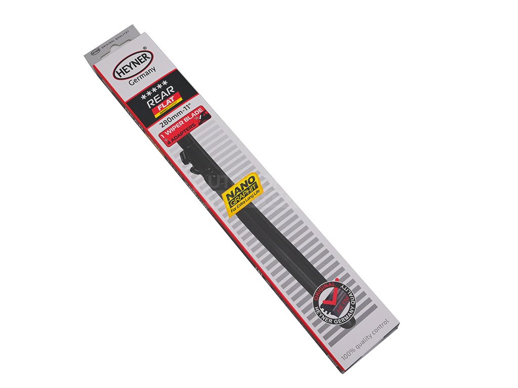 Zadní FLAT stěrač o délce 28 cm se čtyřmi přiloženými adaptéry. Odzkoušeno v praxi, sedí opravdu na jedničku. Výrobek renomovaného německého výrobce Heyner z kvalitního nanografitu, který zajišťuje dlouhodobě rovnoměrné stírání bez šmouh.